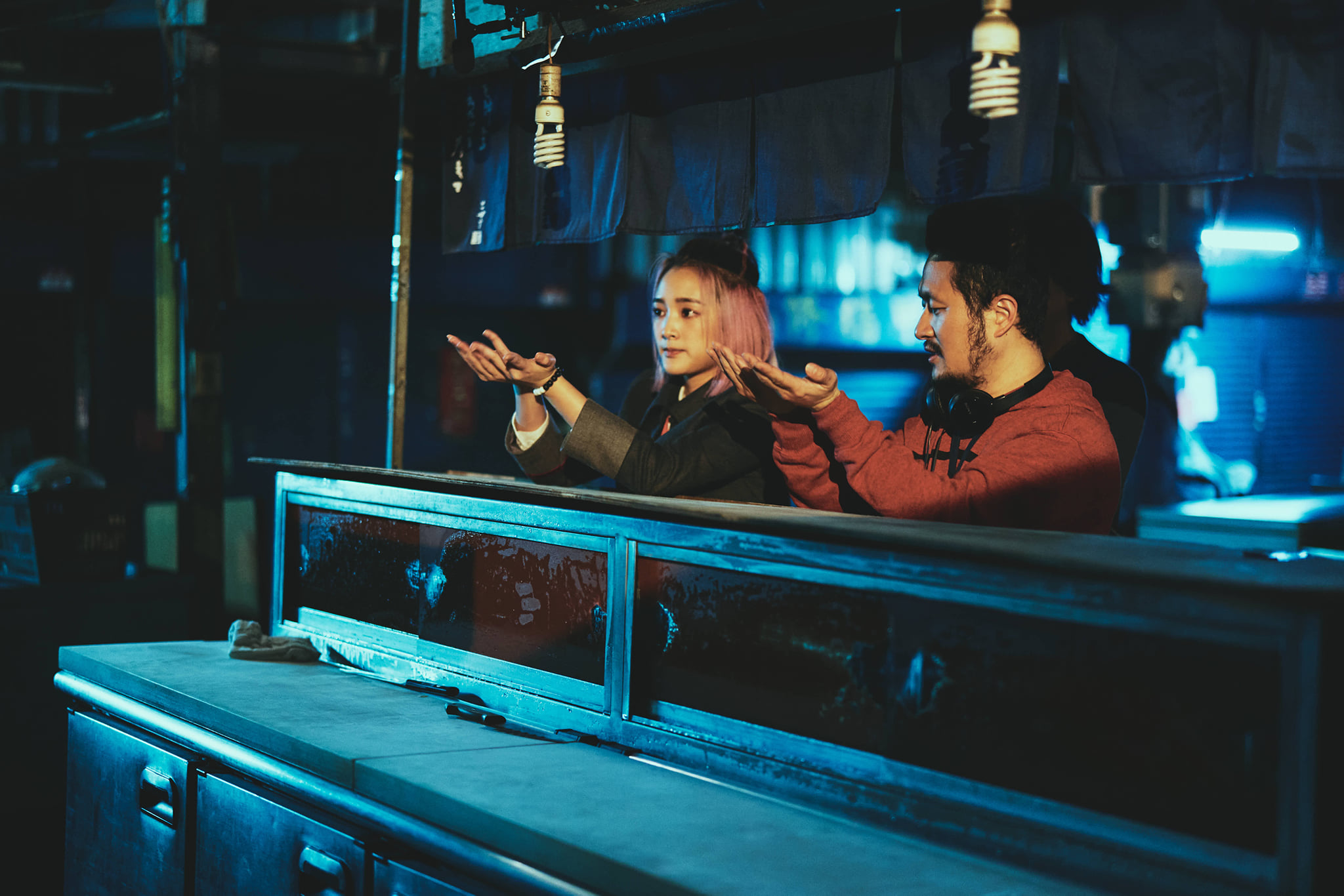 正式來之前,我一如往常秉持著「快樂拍片,精準放飯」的宗旨,很放心地坐在監看螢幕前跟大家講笑話,營造劇組上下一心的團結氣氛,不只王淨的經紀人與妝髮執行在旁邊笑呵呵,就連等一下要一起演出的柯震東也在裡面貢獻笑話。和樂融融,士氣高昂,絕對是拍出好片的前兆。